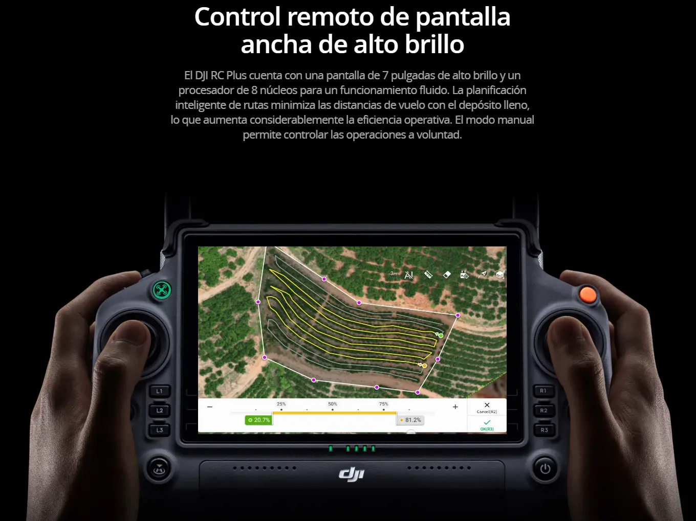El DJI AGRAS T50 es un drone agrícola de alto rendimiento diseñado para realizar tareas de pulverización, esparcimiento y mapeo con máxima eficiencia. Gracias a su sistema de propulsión coaxial de doble rotor, puede transportar hasta 40 kg de líquidos o 50 kg de materiales sólidos. Incorpora un sistema de pulverización atomizada dual con un caudal de hasta 16 L/min (ampliable a 24 L/min con cuatro aspersores), así como un tanque de 75 L para esparcir fertilizantes o semillas a gran velocidad. Equipado con sensores de radar de matriz activa, visión binocular y navegación RTK, el T50 ofrece precisión, seguridad y rendimiento superior en terrenos agrícolas exigentes.